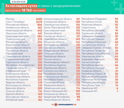 По данным Роспотребнадзора, на сегодняшний день проведено свыше 106,4 млн лабораторных исследований на наличие нового коронавируса. За последние сутки проведено 393 тысячи тестов на коронавирус. Под медицинским наблюдением в целом по России по состоянию на 13.02.2021 остаются 637 223 человека.