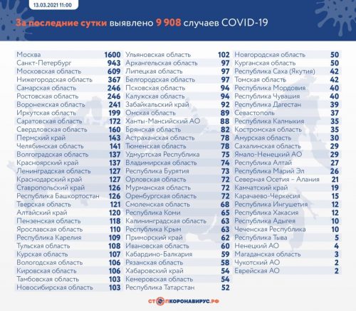 За последние сутки в России выявлено 9 908 случаев COVID-19 в 85 регионах, из них 1 279 (12,9%) — активно у контактных лиц без клинических проявлений болезни.