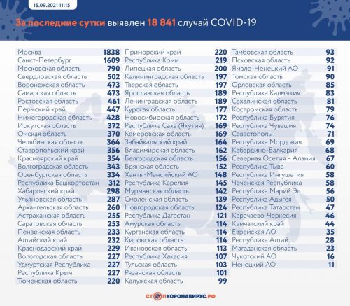 По данным Роспотребнадзора, на сегодняшний день проведено свыше 184,6 млн лабораторных исследований на наличие нового коронавируса. За последние сутки проведено 353 тысячи тестов на коронавирус. Под медицинским наблюдением в целом по России по состоянию на 15.09.2021 остаются 1 123 140 человек.