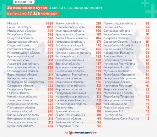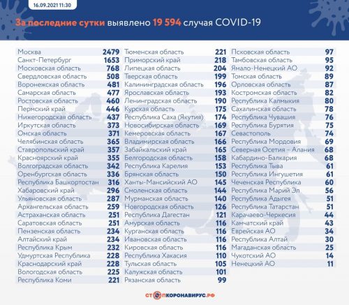 По данным Роспотребнадзора, на сегодняшний день проведено свыше 185,1 млн лабораторных исследований на наличие нового коронавируса. За последние сутки проведено 462 тысячи тестов на коронавирус. Под медицинским наблюдением в целом по России по состоянию на 16.09.2021 остаётся 1 222 531 человек.
