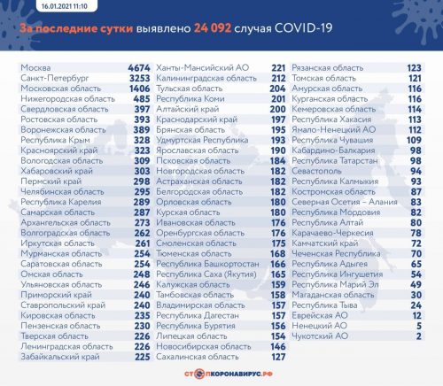 По данным Роспотребнадзора, на сегодняшний день проведено свыше 96,2 млн лабораторных исследований на наличие нового коронавируса. За последние сутки проведено 583 тысячи тестов на коронавирус. Под медицинским наблюдением в целом по России по состоянию на 16.01.2021 остаются 613 592 человека.
