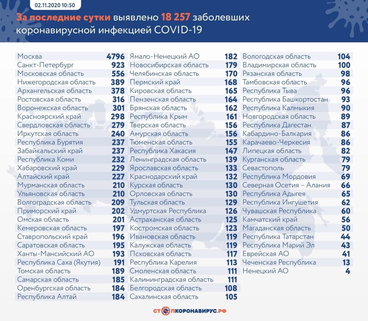 За последние сутки в России выявлено 18 257 новых случаев коронавируса в 84 регионах. Из них 25,1% не имели клинических проявлений болезни.