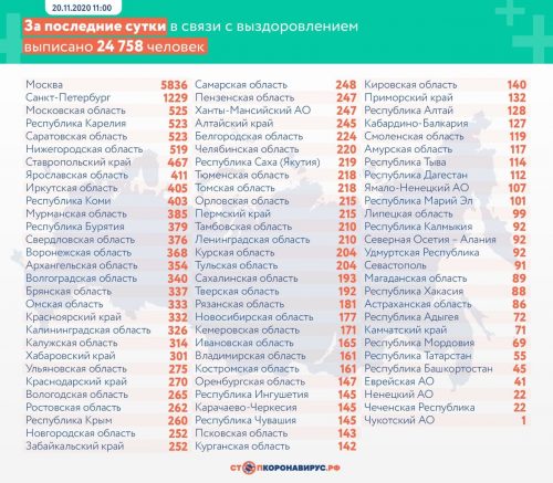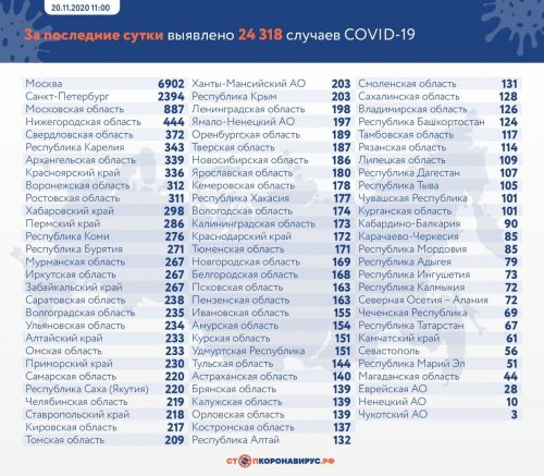 По данным Роспотребнадзора, на сегодняшний день проведено свыше 71,2 млн лабораторных исследований на наличие нового коронавируса .За последние сутки проведено 596 тысяч тестов на коронавирус. Под медицинским наблюдением в целом по России по состоянию на 20.11.2020 остаётся 470 831 человек.
