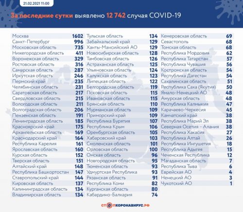 По данным Роспотребнадзора, на сегодняшний день проведено свыше 109 млн лабораторных исследований на наличие нового коронавируса. За последние сутки проведено 368 тысяч тестов на коронавирус. Под медицинским наблюдением в целом по России по состоянию на 21.02.2021 остаются 594 599 человек.