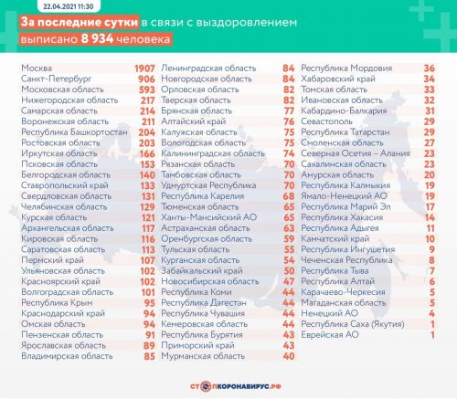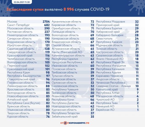 По данным Роспотребнадзора, на сегодняшний день проведено свыше 126,8 млн лабораторных исследований на наличие нового коронавируса. За последние сутки проведено 314 тысяч тестов на коронавирус. Под медицинским наблюдением в целом по России по состоянию на 22.04.2021 остаются 513 528 человек.