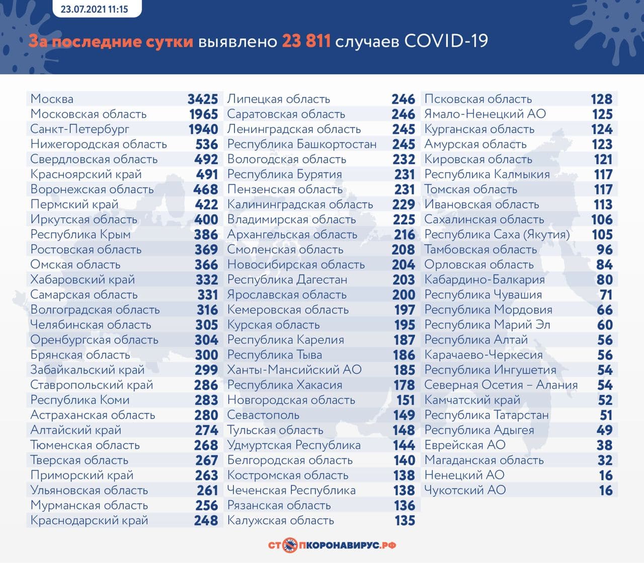 За последние сутки в России выявлено 23 811 случаев COVID-19 в 85 регионах