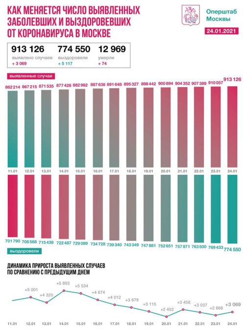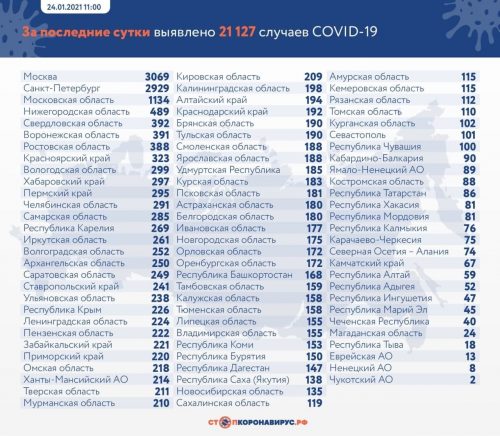 По данным Роспотребнадзора, на сегодняшний день проведено свыше 99,3 млн лабораторных исследований на наличие нового коронавируса. За последние сутки проведена 441 тысяча тестов на коронавирус. Под медицинским наблюдением в целом по России по состоянию на 24.01.2021 остаются 646 587 человек.