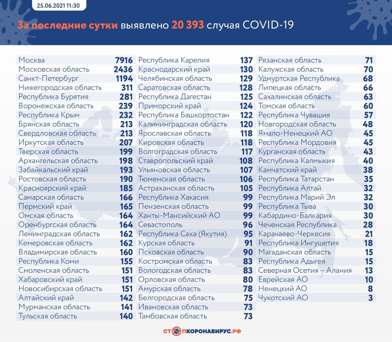 За последние сутки в России выявлено 20 393 случаев COVID-19 в 85 регионах
