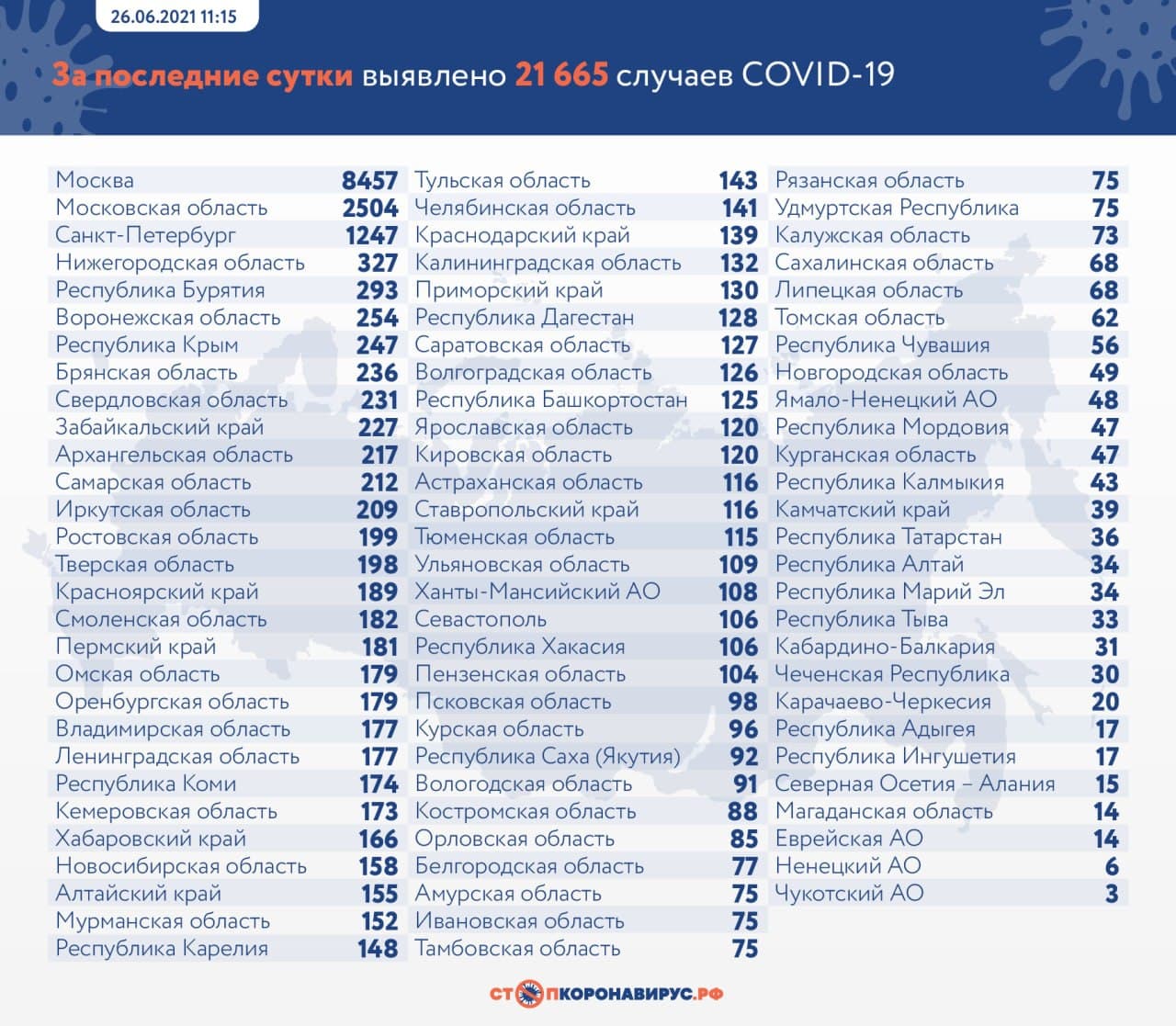 За последние сутки в России выявлено 21 665 случаев COVID-19 в 85 регионах