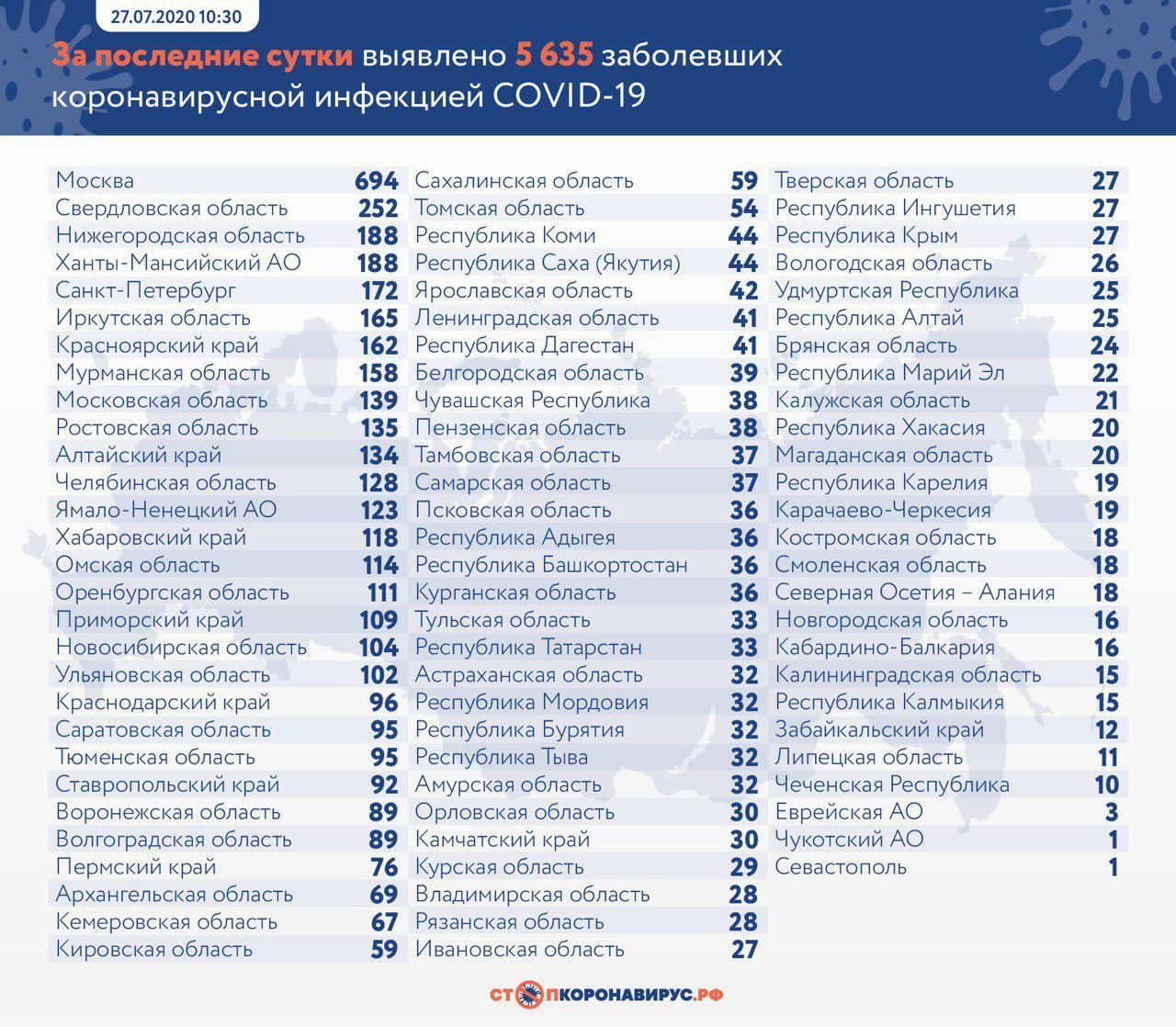 За последние сутки в России выявлено 5 635 новых случаев коронавируса в 84 регионах.