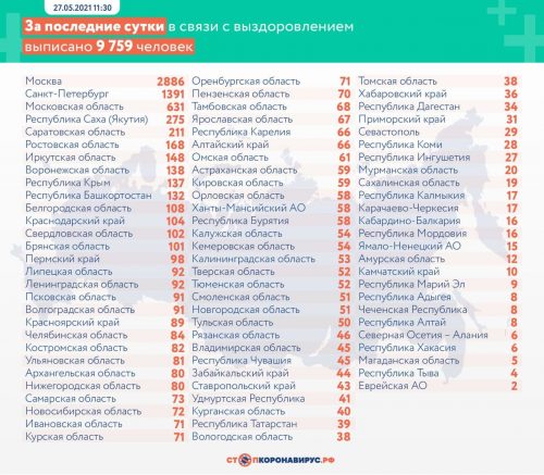 По данным Роспотребнадзора, на сегодняшний день проведено свыше 136,8 млн лабораторных исследований на наличие нового коронавируса. За последние сутки проведено 338 тысяч тестов на коронавирус. Под медицинским наблюдением в целом по России по состоянию на 27.05.2021 остаётся 517 061 человек.