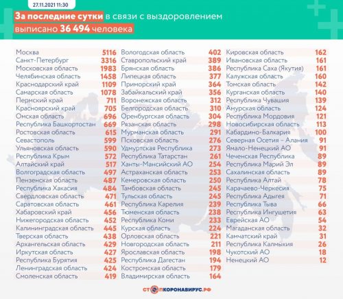 По данным Роспотребнадзора, на сегодняшний день проведено свыше 223,5 млн лабораторных исследований на наличие нового коронавируса . За последние сутки проведена 581 тысяча тестов на коронавирус. Под медицинским наблюдением в целом по России по состоянию на 27.11.2021 остаются 1 813 902 человека.