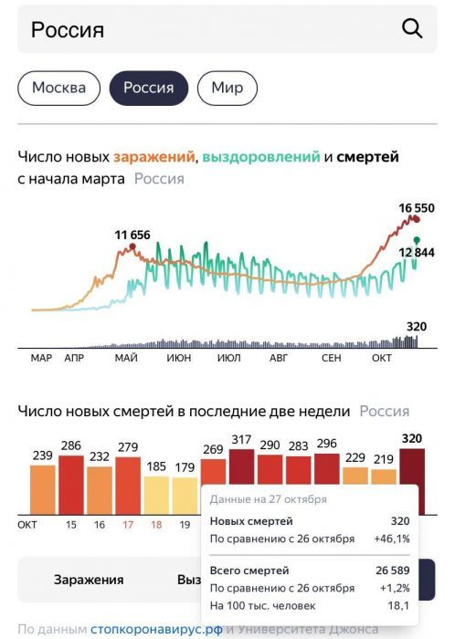 По данным Роспотребнадзора, на сегодняшний день проведено свыше 58,2 млн лабораторных исследований на наличие нового коронавируса. За последние сутки проведено 402 тысячи тестов на коронавирус. Под медицинским наблюдением в целом по России по состоянию на 27.10.2020 остаются 355 396 человек.