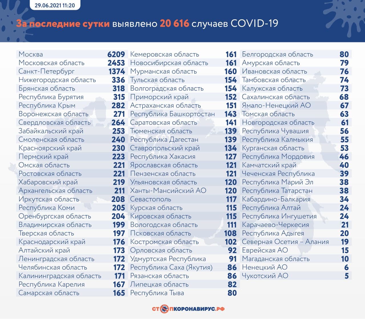 За последние сутки в России выявлено 21 665 случаев COVID-19 в 85 регионах