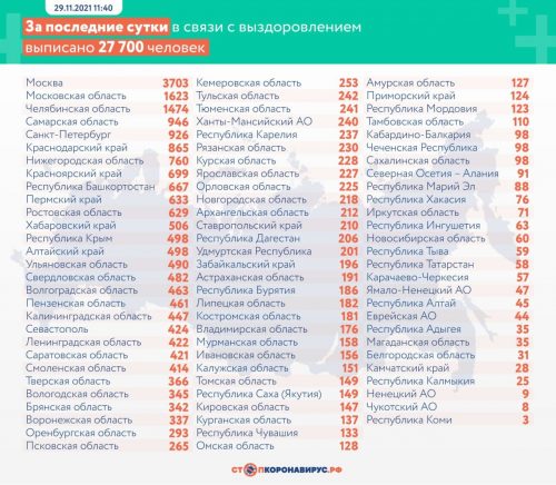 По данным Роспотребнадзора, на сегодняшний день проведено свыше 224,5 млн лабораторных исследований на наличие нового коронавируса. За последние сутки проведено 450 тысяч тестов на коронавирус. Под медицинским наблюдением в целом по России по состоянию на 29.11.2021 остаются 1 785 055 человек.