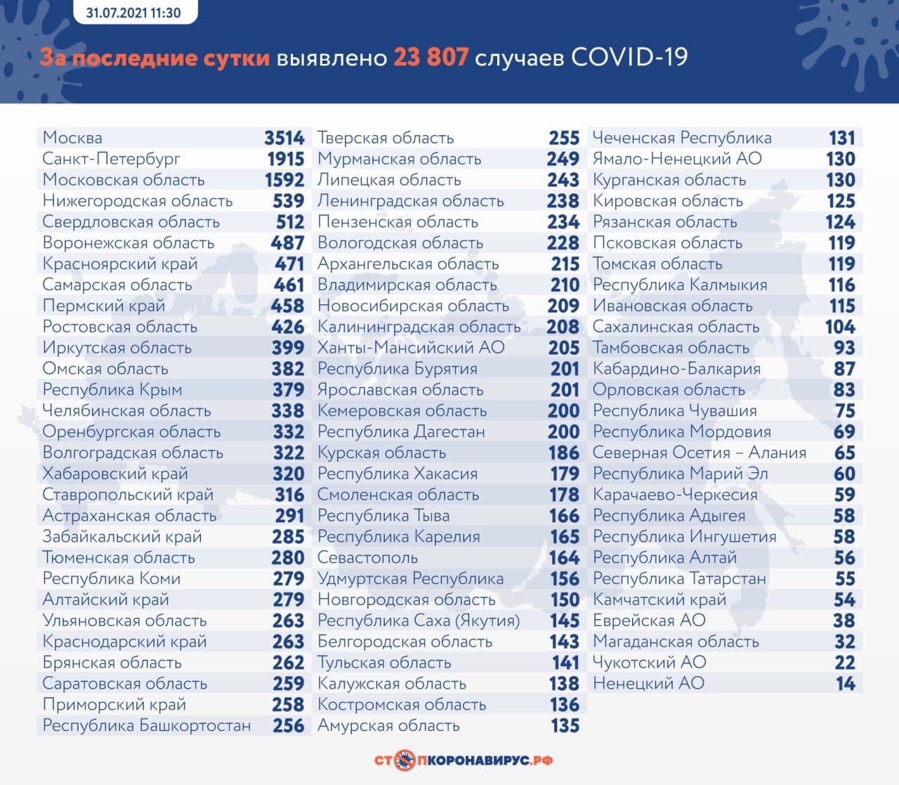 За последние сутки в России выявлено 23 807 случаев COVID-19 в 85 регионах