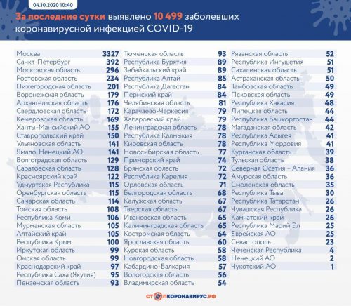За последние сутки в России подтвержденных случаев COVID-19 – 10 499 в 85 регионах, в том числе выявлено активно 2 920 (27,8%) без клинических проявлений.