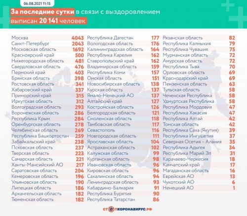 По данным Роспотребнадзора, на сегодняшний день проведено свыше 168 млн лабораторных исследований на наличие нового коронавируса. За последние сутки проведено 536 тысяч тестов на коронавирус. Под медицинским наблюдением в целом по России по состоянию на 06.08.2021 остаются 1 257 192 человека.