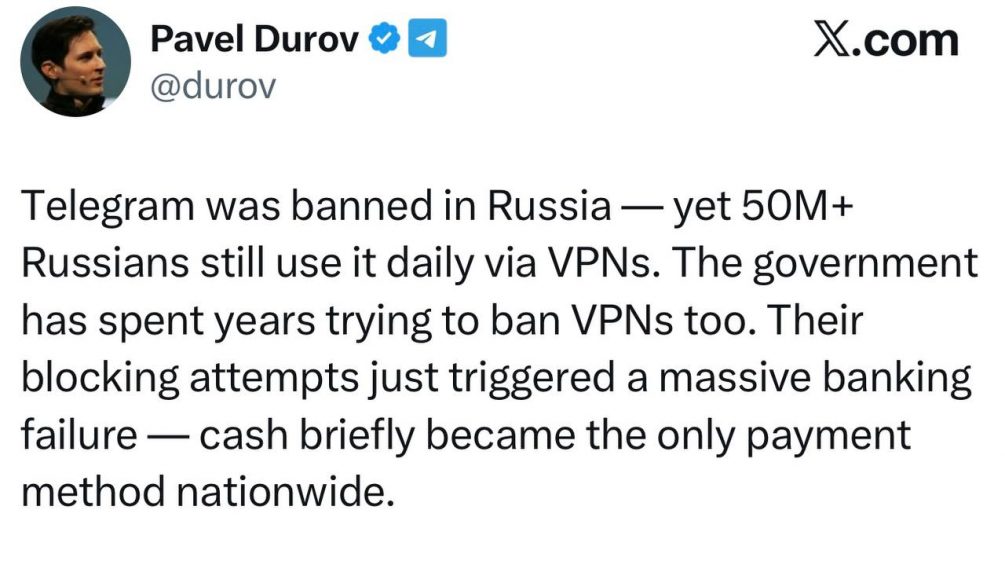 «Добро пожаловать обратно в «Цифровое сопротивление», мои русские братья и сестры. Теперь вся нация мобилизована, чтобы обойти эти абсурдные ограничения. Тысячи людей создают VPN и прокси. С нашей стороны мы будем продолжать адаптироваться — делая трафик Телеграма ещё труднее обнаружить и заблокировать», - написал он.