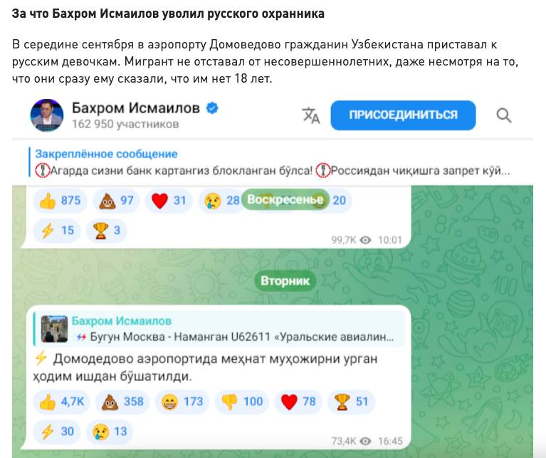 Экс-глава узбекской диаспоры Бахром Исмаилов как раз один из таких представителей. В 2024 году он с гордостью объявил, что добился увольнения сотрудника охраны в аэропорту Домодедово. Вина охранника заключалась в том, что тот встал на защиту несовершеннолетних девушек, к которым приставал мигрант. Девочки пытались отделаться от приставучего узбека, а в ответ услышали, что все «русские девушки легкого поведения». Вот и обратились к охраннику, а тот применил силу к гостю, за что и поплатился.