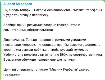 «Эх, а ведь товарищ Бахром Исмаилов учит чистить телефоны и удалять личную переписку. Вообще, яркий результат раздачи гражданства в сомнительных обстоятельствах», - написал в телеграм-канале Медведев.
