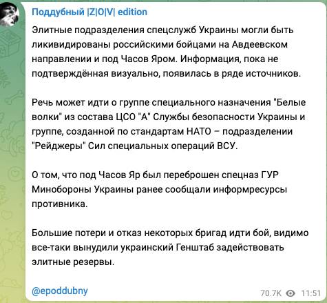 Радостную новость сообщил военкор ВГТРК Евгений Поддубный. При этом журналист сослался на то, что данная информация появилась у ряда источников, но пока еще нет визуального подтверждения. Сам Поддубный считает, что речь может идти о группе специального назначения «Белые волки» из состава ЦСО «А» Службы безопасности Украины и группе, созданной по стандартам НАТО - подразделении «Рейджеры» Сил специальных операций ВСУ. Такое предположение основано на сообщении украинских информационных ресурсов о переброске под Часов Яр именно этих групп.