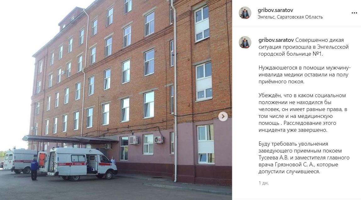 «Совершенно дикая ситуация произошла в Энгельсской городской больнице №1, сообщил Грибов. - Нуждающегося в помощи мужчину-инвалида медики оставили на полу приёмного покоя. Убеждён, что в каком социальном положении не находился бы человек, он имеет равные права, в том числе и на медицинскую помощь».