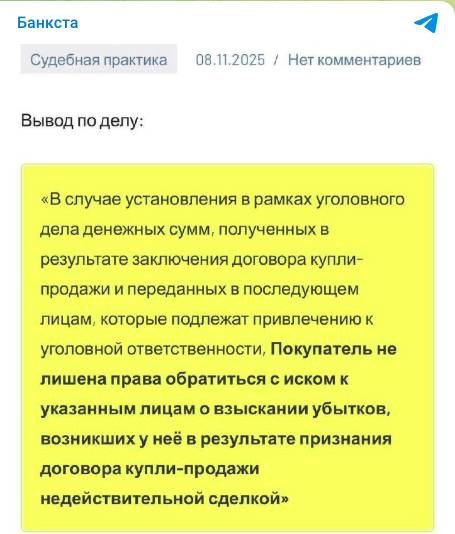 Не смог пройти мимо журналист Сергей Колясников (Zergulio), который эмоционально отреагировал на такое решение. «Блеск. То есть ты купил у конкретного человека квартиру. Ее у тебя отняли, а деньги отправляют требовать на Украину, например. Потому что тот, кто с оформлением всех документов тебе эту квартиру продал ... «несущественный участник сделки». А неизвестные мошенники, которым Долина без всякого участия покупательницы передала деньги - существенный. Это какой-то маразм уже просто. А если бы Долина проиграла деньги в казино - покупательнице надо было бы их с казино требовать? Удобно. Столько перспектив открывается», - прокомментировал Колясников, завершив словами «мрачный маразм просто».