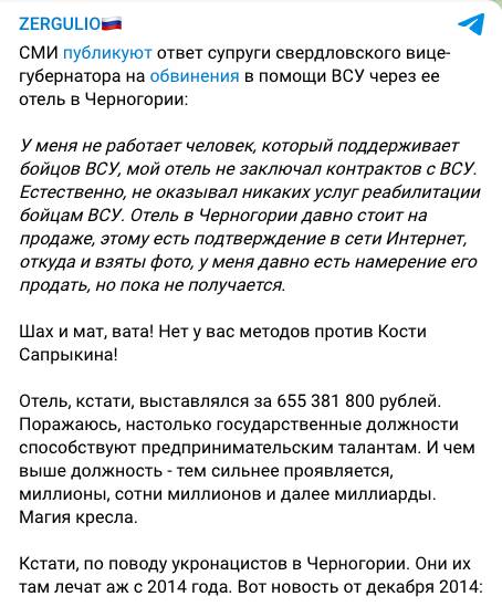 Чемезова не стала отрицать, что отель ее, но там «не работает человек, поддерживающий бойцов ВСУ, мой отель не заключал контрактов с ВСУ, естественно не оказывал никаких услуг реабилитации бойцам ВСУ». Также в своем телеграм-канале владелица написала, что она выставила отель на продажу, чему есть доказательства, но пока с продажей дело не идет. Смеем предположить, что цена слишком высока, потому и покупателя найти крайне сложно в кризисное европейское время. А так, по словам Чемезовой, все эти разговоры и сообщения ничто иное, как «заказы определенной группы лиц».