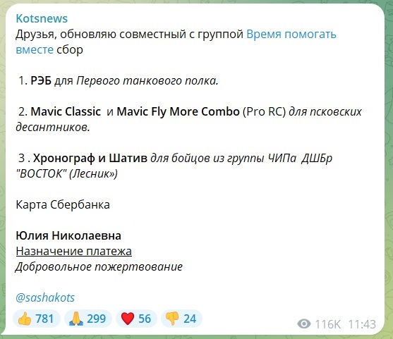 Напомним, что с апреля в Минобороны арестовали ряд высокопоставленных офицеров, которые обвинены в коррупции. У них нашли роскошные авто, особняки, замки и другую элитную недвижимость. При этом на третий год спецоперации военкоры продолжают собирать бойцам деньги на дроны, прицелы, экипировку и прочее вооружение, а волонтёры шьют маскировочные сети и заготавливают окопные свечи.