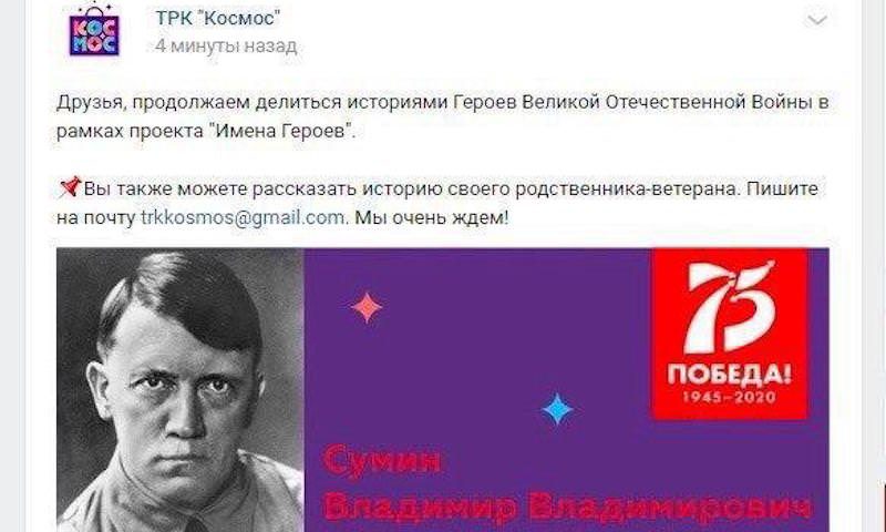 В одном из постов-участников рассказывалась история некоего Владимира Сумина, который активно участвовал в боях на протяжении всей войны и якобы погиб в 1945 году во время Висло-Одерской операции. Правда, опубликован этот пост был с фото Адольфа Гитлера, которому убрали знаменитые усики.