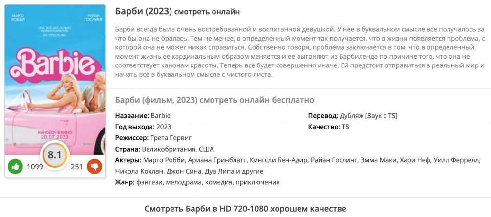 Перед главными премьерами лета, такими как «Оппенгеймер» от режиссера Кристофера Нолана и «Барби» от режиссера Греты Гервиг, каналы распространения пиратских копий были успешно заблокированы. Хотя если вбить в строке поиска «Барби смотреть онлайн», то можно увидеть, что фильм давно выложен и его уже посмотрели все, кто хотел.