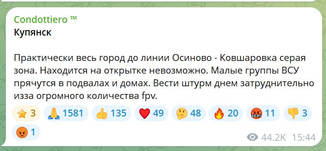 По данным военного корреспондента Юрия Подоляки, ситуация в Купянске остаётся сложной, но наши силы постепенно усиливают позиции в городе. Несмотря на попытки антикризисных авторов представить ситуацию как будто город уже почти полностью «серая зона», фактическая картина иная.