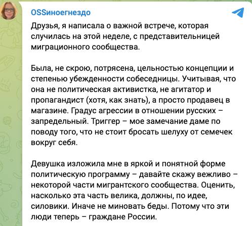 «Девушка изложила мне в яркой и понятной форме политическую программу – давайте скажу вежливо – некоторой части мигрантского сообщества. Оценить, насколько эта часть велика, должны, по идее, силовики. Иначе не миновать беды. Потому что эти люди теперь – граждане России», - написала Осс в телеграм-канале.