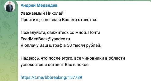 «Уважаемый Николай, извините, я не знаю вашего отчества. Пожалуйста, свяжитесь со мной. Я заплачу ваш штраф в размере 50 000 рублей. Надеюсь, что после этого все чиновники в регионе успокоятся и оставят вас в покое», – написал в телеграм-канале депутат.