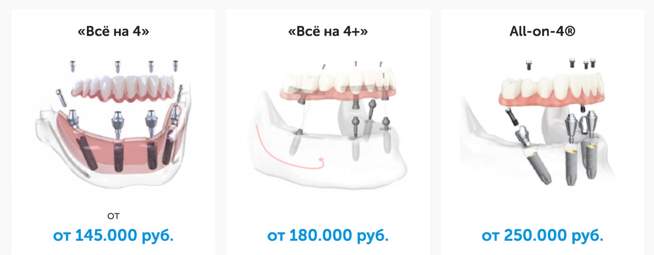 Протезирование все-на-4 и все-на-6 предусматривает установку в ротовую полость несъемной конструкции. Протез крепится на импланты зубов, которые доктор устанавливает в десну в количестве 4 или 6 штук (в зависимости от сложности врачебной ситуации).