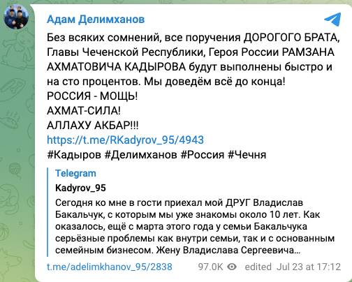 Но Владислав Бакальчук отступать не намерен и готов спасти семью, как и бизнес. Накануне он обратился к главе Чечни Рамзану Кадырову, с которым поддерживает теплые отношения 10 лет. И Кадыров "вписался", пообещав вернуть бизнес и семью. Он поручил разобраться в происходящем Адам Делимханова.