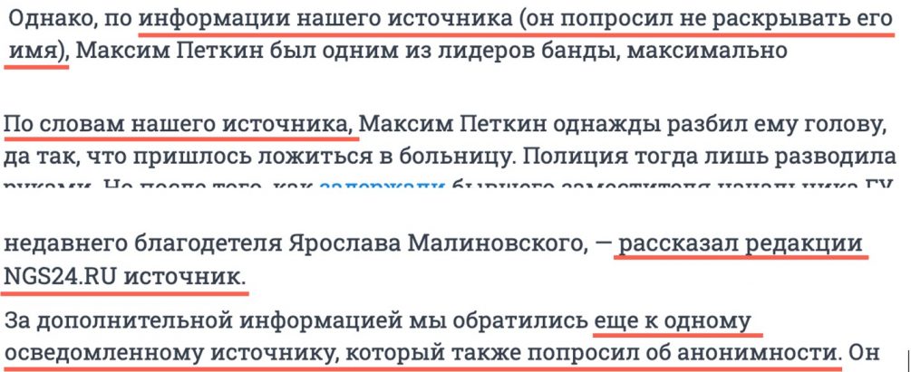 И так везде по тексту. Везде «анонимные источники» рассказывают о беспределе, которые творили «члены банды». Кто эти загадочные анонимные источники, что конкретно они знают и как могут подтвердить криминал, редакция не рассказывает.
