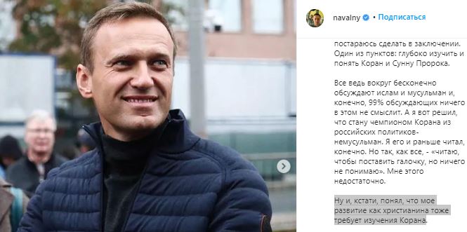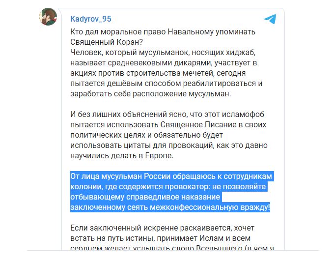 Глава Чечни убежден, что «исламофобские» взгляды Навального, и его образ жизни «не имеют ничего общего с верой, тем более с Исламом»
