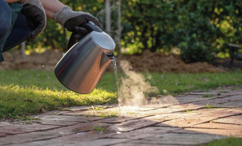 2. Кипяток. Просто вскипятите чайник с водой и вылейте ее на сорняки и стыки между плитками.