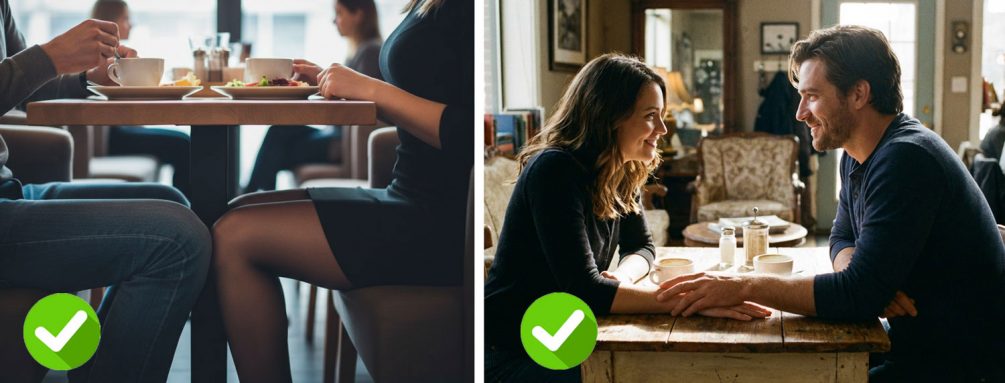 - Во-первых, выбирайте место, где вы можете сесть рядом на одном диванчике — это, кстати, вообще универсальный метод, если хотите стать ближе.