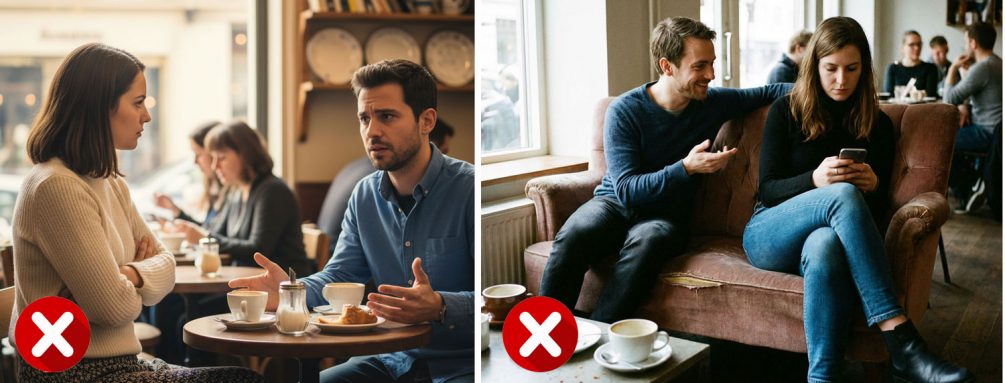 Есть множество невербальных признаков и они даже изучены в исследованиях. Есть предварительные сигналы, а есть уже те, которые прямо говорят: сейчас можно попробовать. Предварительные, например, такие: девушка не отдергивает руку, если мужчина ее касается, не отодвигается, если мужчина садится вплотную. Это довольно характерный признак. Если вы в кафе, можно будто случайно дотронуться коленом о ее колено, сесть ближе, чтобы показать что-то на телефоне. Посмотрите на ее реакцию: если она отсаживается, отворачивается, скрещивает руки на груди, закидывает ногу на ногу — это защитная поза, сейчас она не готова к сближению. Не обязательно это окончательное «нет», тут надо смотреть по ситуации.