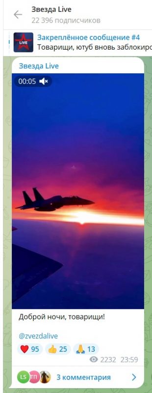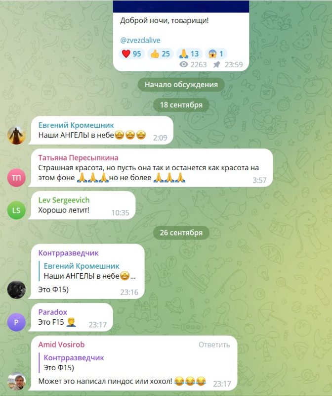 В частности, канал «Рамзай» написал: «Неее, я всё понимаю! Но это же «Звезда»! Лицо нашего Минобороны! И пожелать «спокойной ночи » пиндосским «F-15», это сильно! Надеюсь, это выставивших долго и вдумчиво наставят на путь истинный и заставят учить матчасть!»