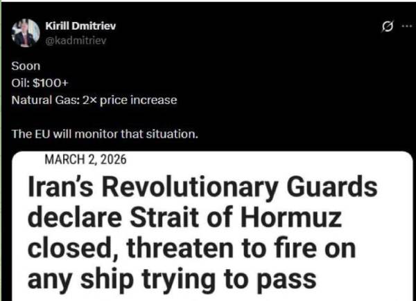 Специальный представитель президента РФ Кирилл Дмитриев прокомментировал закрытие Ормузского пролива тем, что скоро будет огромный рост стоимости нефти. Нефть скоро превысит $100 за баррель, «вангует» Дмитриев. Хотя некоторые эксперты прогнозируют и все $200.