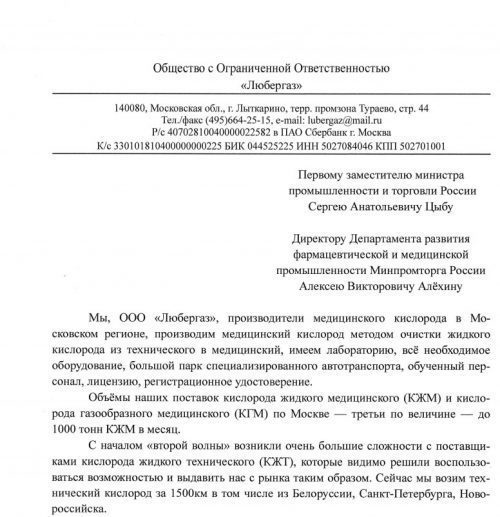 В письме в Минпромторг Козырев отмечал, что «Любергаз» является третьим по объемам поставок медицинского кислорода в Москву — до 1 тыс. в месяц.