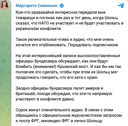 «Кое-что крааааайне интересное передали мне товарищи в погонах как раз в тот день, когда Шольц сказал, что НАТО не участвует и не будет участвовать в украинском конфликте. Такое увлекательное чтиво и аудио, что мне очень хочется его опубликовать. Порадовать подписчиков. На этой интереснейшей записи высокопоставленные офицеры бундесвера обсуждают, как они будут бомбить (внимание!) Крымский мост. И как бы им так половчее это сделать, чтобы при этом их Шольц мог продолжать говорить, что его хата с краю», - написала в телеграм-канале Симоньян.