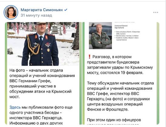 Назвала Симоньян и фамилии офицеров, принимавших участие в обсуждении 19 февраля 2024 года операции. Так, среди участников был начальник отдела операций и учений командования ВВС бундесвера Грефе, инспектором BBC бундесвера Герхартцем и сотрудники центра воздушных операций космического командования бундесвера Фенске и Фроштедте.