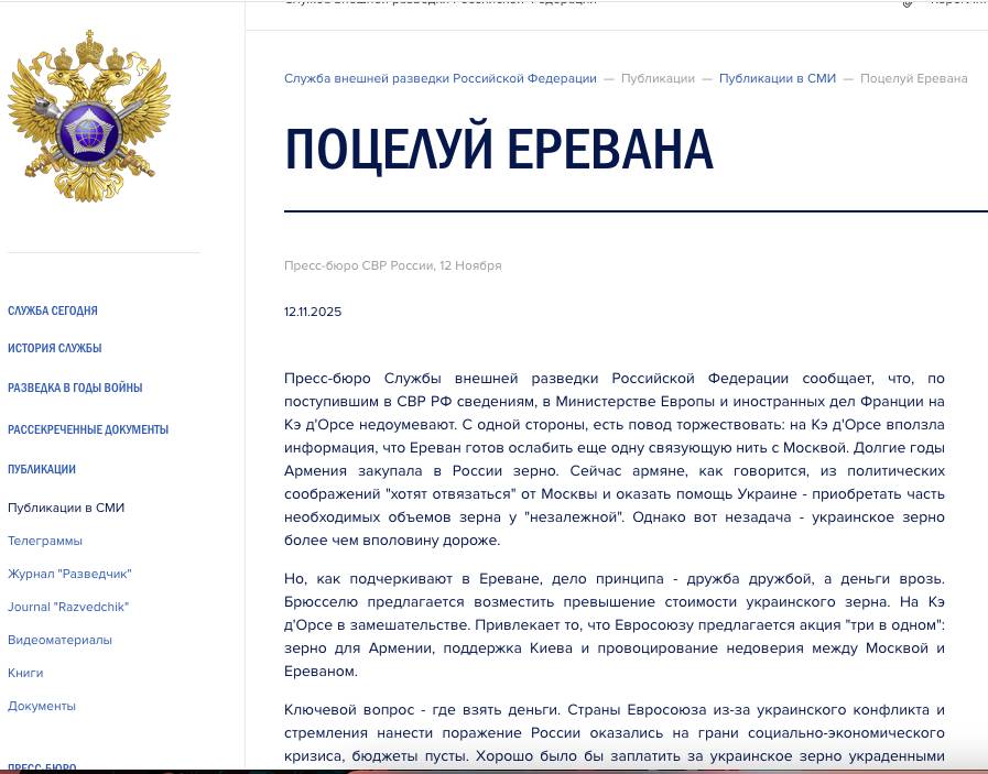 СВР стало известно об отказе Еревана приобретать российское зерно, чтобы помочь Украине на деньги ЕС.