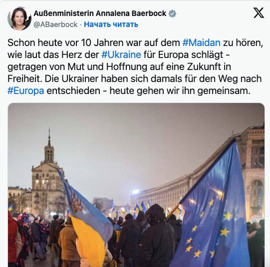«Десять лет назад на Майдане уже можно было услышать, как громко бьется сердце Украины за Европу, полное мужества и надежды на будущее в свободе», - написала Бербок в соцсетях.