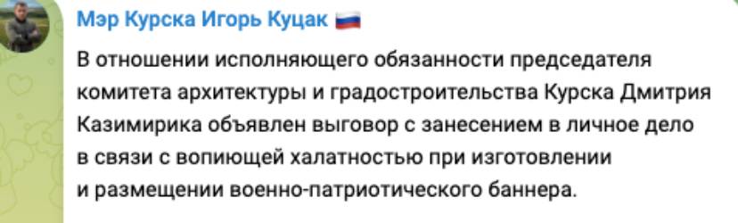 Примечательно, что на баннер обратили внимание СМИ и телеграм-каналы города, которые и подняли шум. Виновного быстро вычислили и наказали. Как сообщил мэр Курска Игорь Куцак, и.о. председателя комитета архитектуры и строительства, ответственному за изготовление и размещение баннера, объявлен выговор «в связи с вопиющей халатностью при изготовлении и размещении военно-патриотического баннера».